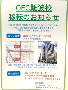 ⭐︎大阪英会話スクールなんば校☆ Blog 2024/10/21 こんにちは♪OEC英会話スクール難波校です♡ この度難波校が、2024年11月25日(月)より移転することになりました☆ ・新しい住所 大阪市中央区難波2-2-3 御堂筋グランドビル15階 ご不便をおかけして申し訳ございませんm(__)m お間違いのないようご注意くださいませ。 ブログ一覧へ戻る